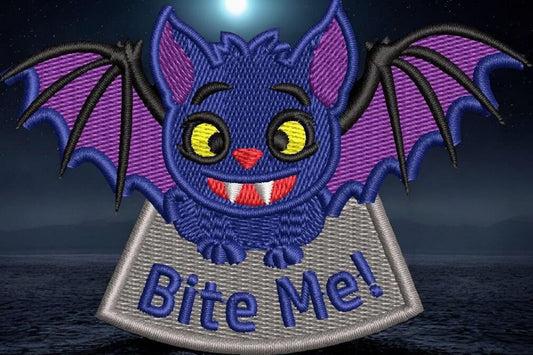 Bite Me Vampire Bat Iron on Patch, Halloween Smiley Bat Badge, Gothic Embroidered Patch, Spooky Gift, Creepy Applique