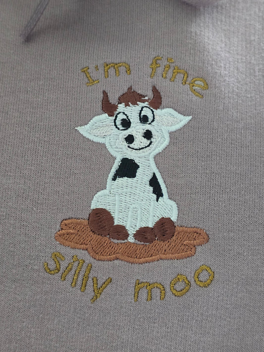 GILDAN Hoodie, Embroidered Hoodie, Unisex Gift, Embroidered Hoodie – Cow Sitting in Muddy Puddle with wording 'I'm Fine, Silly Moo'