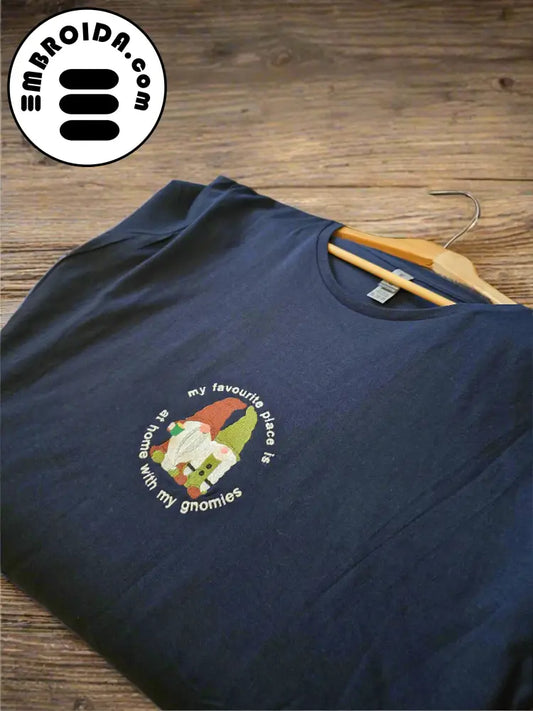 Embroidered 'At Home with My Gnomies' Tee, Navy Blue Funny Tshirt, Gnome Lovers Gift